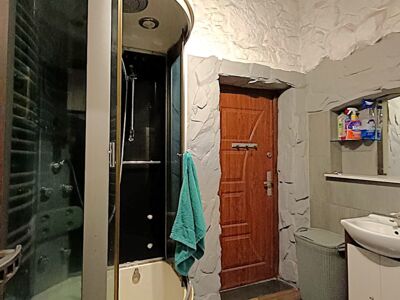 Druga z części stanowi pokój dzienny z aneksem kuchennym, sypialnię oraz łazienkę z prysznicem i przedpokój.