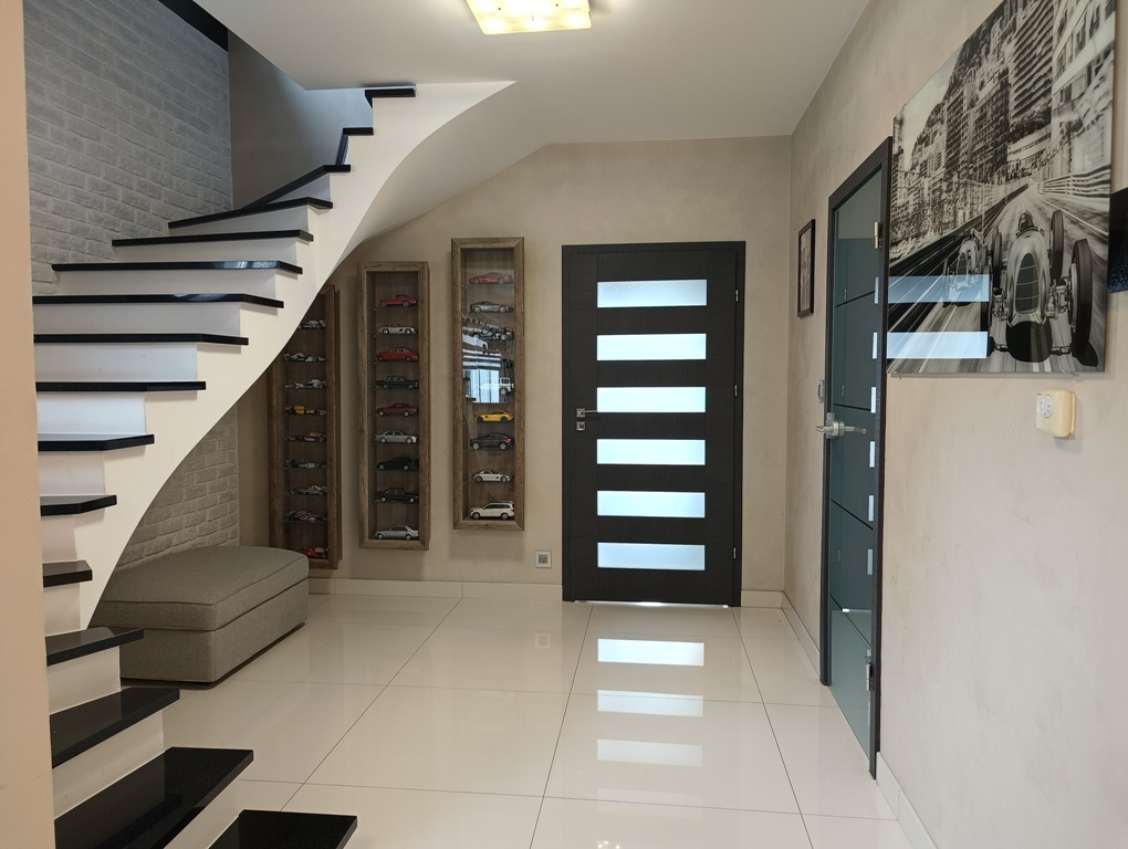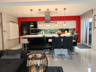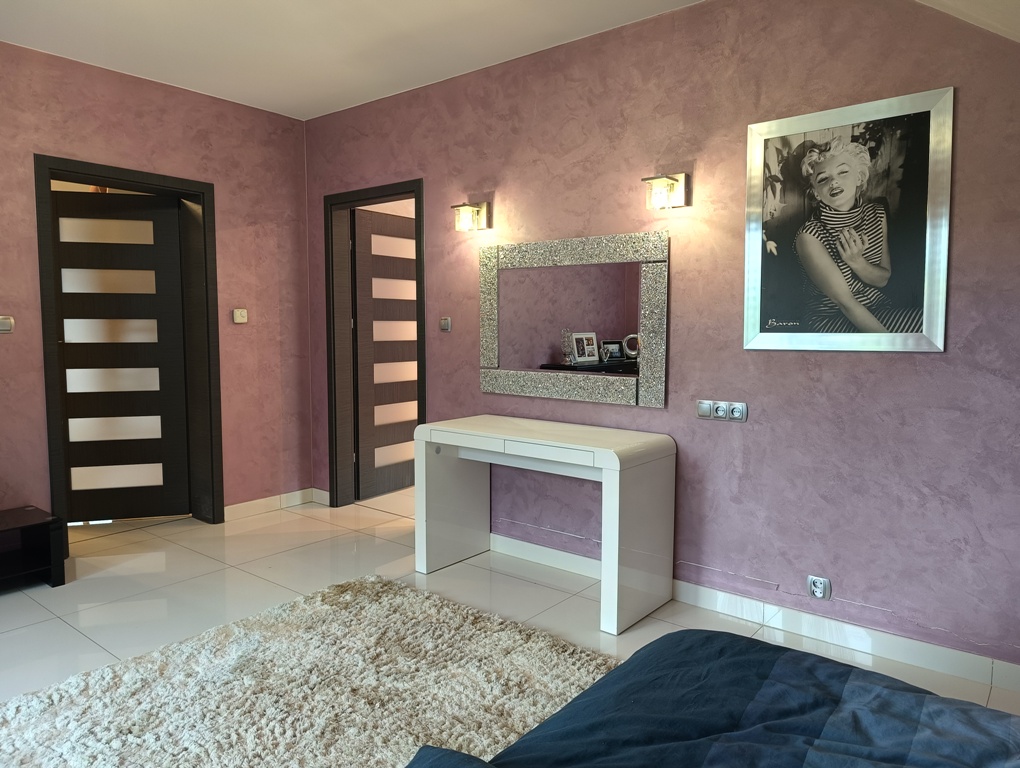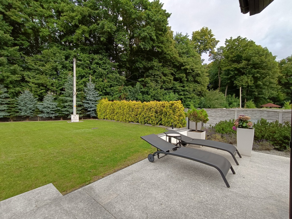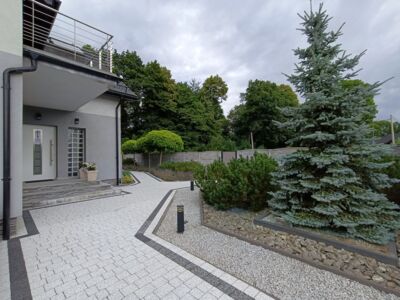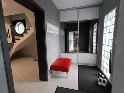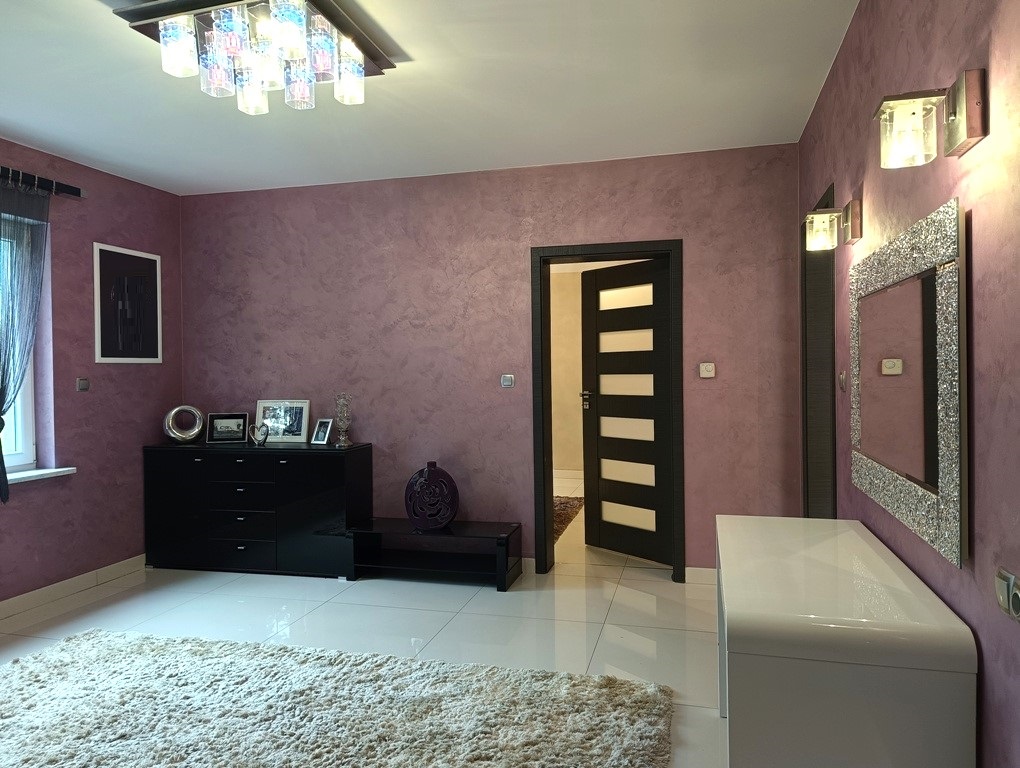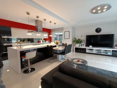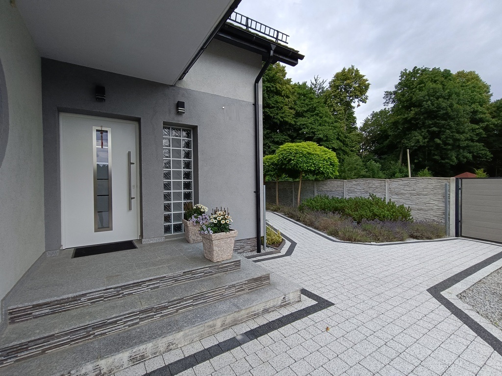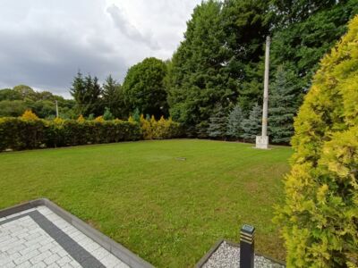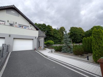 Do sprzedania nowoczesny, gotowy do zamieszkania dom zlokalizowany w odległości 7 km od centrum Zgorzelca, w Pokrzywniku. Dom w zabudowie bliźniaczej o powierzchni około 190 m2 wybudowany został pod koniec 2010 roku wg. indywidualnego projektu. Przestrzeń parteru stanowi przestronny salon o powierzchni 52 m2 z aneksem kuchennym, hol, pierwsza z łazienek wyposażona w natrysk, wiatrołap. Piętro to dwie przestronne sypialnie z garderobami oraz druga łazienka wyposażona w wannę. Dodatkowo w bryle budynku znajduje się garaż o powierzchni 24 m2 oraz pomieszczenie gospodarcze. Nowoczesne wnętrza są dobrze doświetlone przez duże przeszklenia zapraszające do środka zieleń ogrodu. Okna posiadają zewnętrzne elektryczne rolety. Na podłogach we wszystkich pomieszczeniach w domu ułożono wielkoformatowe płytki. Przemyślana kuchnia w stałej zabudowie wyposażona jest w wysokiej klasy sprzęty AGD wraz z wbudowanym ekspresem do kawy. Centralne ogrzewanie domu (w całości podłogowe) zasilane za pomocą pieca na pelet. Dom okala zadbany ogród z wypielęgnowanym trawnikiem, ozdobnymi nasadzeniami i oświetleniem. Powierzchnia działki wynosi 819 m2. Całość ogrodzona. W bezpośrednim sąsiedztwie znajdują się zabudowania jednorodzinne. Nieruchomość w wysokim standardzie, nie wymagająca wkładu. W cenie nieruchomości kupujący otrzymuje kompletne wyposażenie wraz z umeblowaniem i sprzętami.