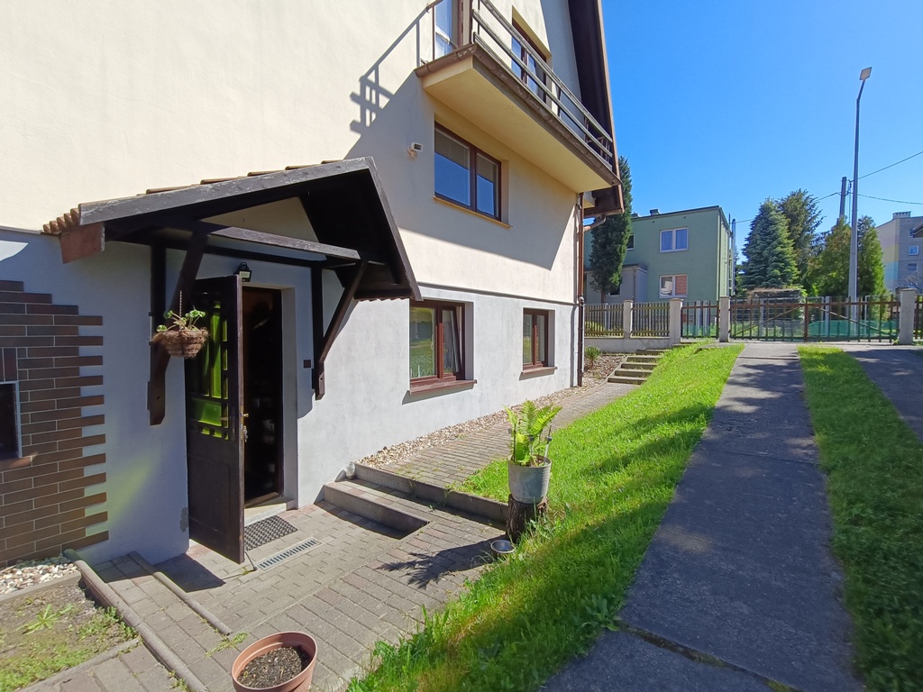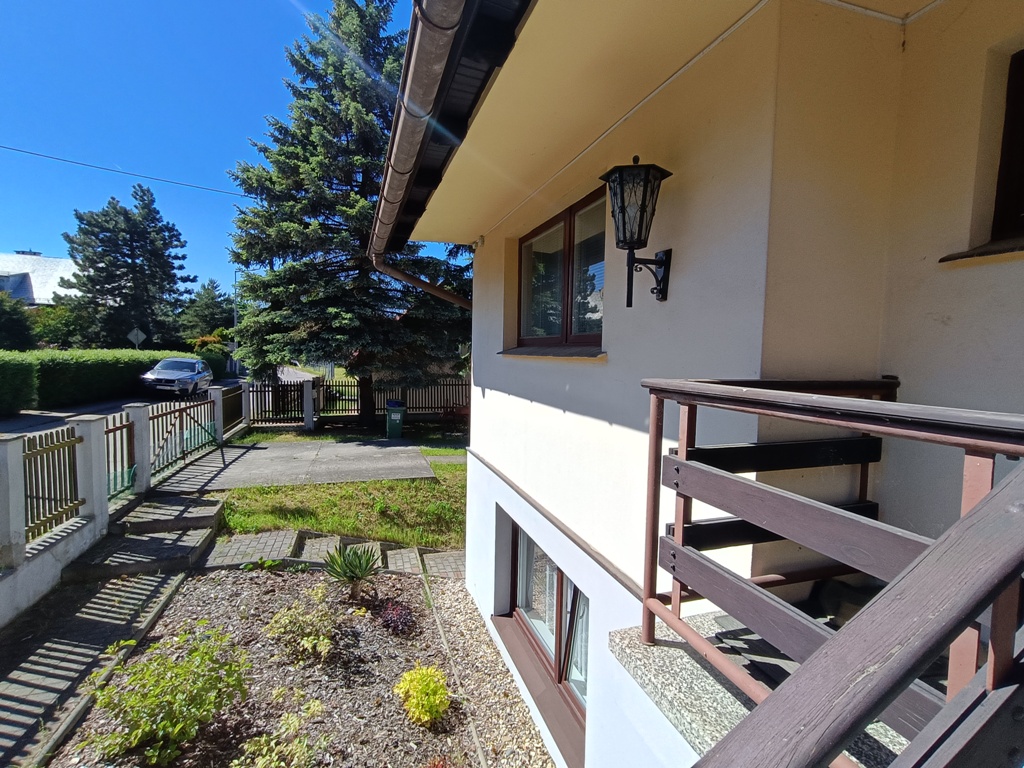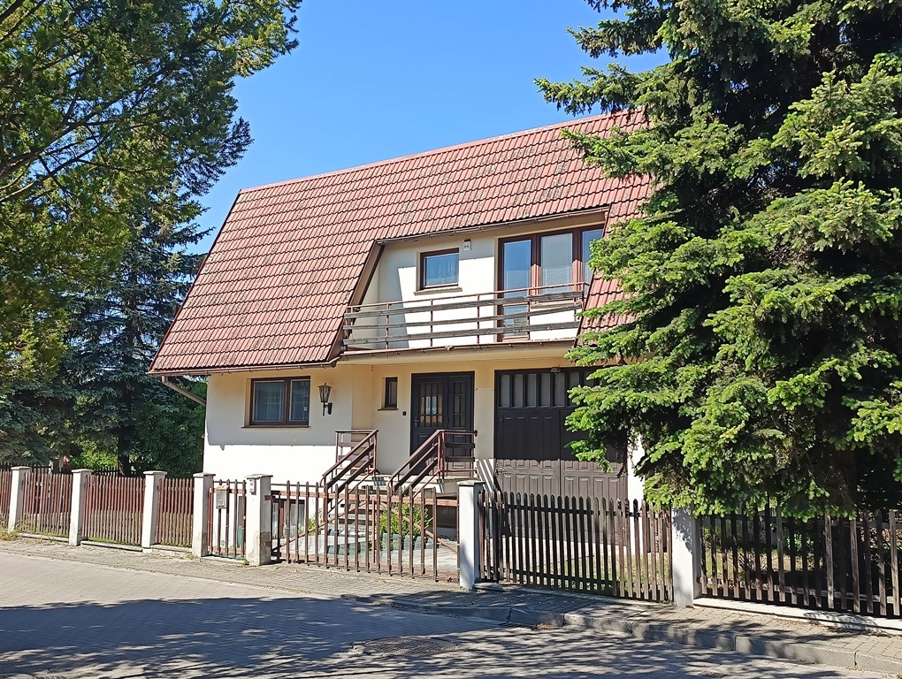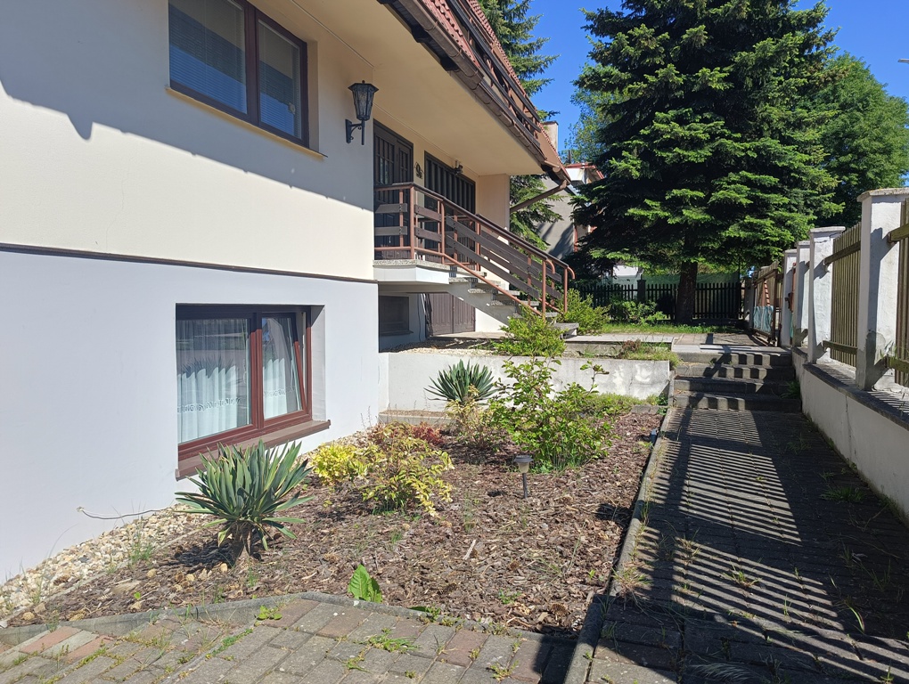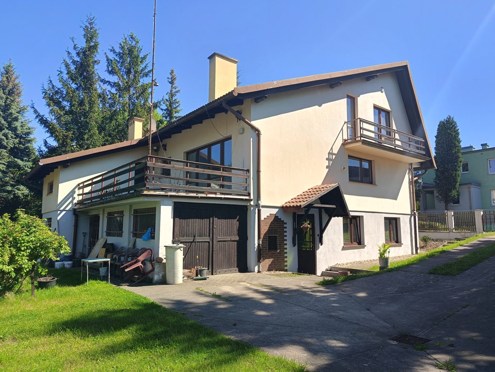 Do sprzedania wolnostojący dom z końca lat 80tych. Budynek 3 kondygnacyjny zlokalizowany w południowej części miasta przy ulicy o niewielkim natężeniu ruchu. Powierzchnia budynku wynosi około 150 m2. Na wysokim parterze znajduje się hol z komunikacją, wiatrołap, kuchnia, WC, przestronny wysoki salon z wyjściem na taras. Poddasze to 3 sypialnie, garderoba, łazienka. Dwie z sypialni posiadają wyjście na balkony. W przyziemiu znajduje się duży, wysoki garaż z kanałem, pomieszczenia gospodarcze w tym pralnia oraz sauna z łazienką. Przestrzeń przyziemia stanowi także osobne 2 pokojowe mieszkanie z garażem które wynajmowane może stanowić źródło dodatkowego dochodu. Centralne ogrzewanie domu zasilane za pomocą pieca z podajnikiem na ekogroszek. Stolarka okienna drewniana. Dom posadowiony na działce o powierzchni 884 m2. Całość ogrodzona z dwoma bramami wjazdowymi i furtkami. Na posesji znajduje się altanka, nasadzenia drzew i krzewów ozdobnych i owocowych. Spokojna, bezpieczna okolica i przyjazne sąsiedztwo. W bliskiej odległości szkoła podstawowa, market spożywczy, przedszkole i przystanek komunikacji miejskiej.