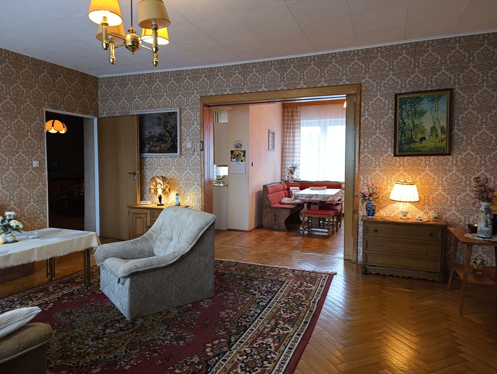 Mieszkanie posiada wyjątkowy układ funkcjonalny. W sypialniach przewidziano wnęki na szafy, jedna z sypialni dobrze doświetlona z aż trzema oknami możne stanowić biuro lub pracownię, salon połączony z jadalnią przez oryginalne szerokie przesuwne drzwi. W większości pomieszczeń zachowane drewniane podłogi. Centralne ogrzewanie zasilane za pomocą dwufunkcyjnego pieca gazowego zainstalowanego w łazience. Stolarka częściowo wymieniona na PCV. W ramach przysługującego udziału związanego z lokalem właścicielowi przysługuje prawo do korzystania z części działki na której posadowiony jest budynek i dodatkowo działka przy zachodniej i północnej ścianie budynku o powierzchni 207 m2. Na działce liczne nasadzenia ozdobne i wysokie drzewa osłaniające działkę od ulicy Zamiejsko-Lubańskiej. W bezpośrednim sąsiedztwie znajdują się zabudowania jednorodzinne, a w bliskiej odległości przedszkole i plac zabaw, market spożywczy oraz centrum handlowe. Lokalizacja ta jest również dobrze skomunikowana z obwodnicą miasta i drogą wojewódzką nr 352 Zgorzelec – Bogatynia.