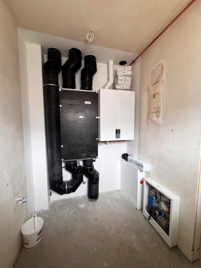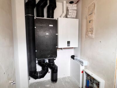 • centralnego ogrzewania (podłogowego na całym parterze) a na piętrze w pokojach z grzejnikami, sterowaną programatorem elektronicznym